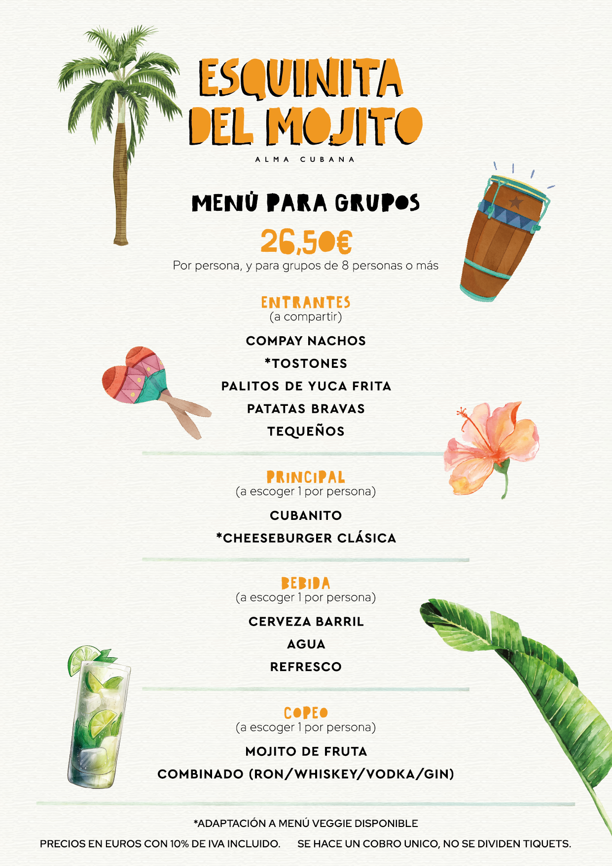 Somos las calles de La Habana, la campiña camagüeyana, y la personalidad de Santiago de Cuba. Ya sea para pasar un rato en familia en nuestro salón principal lleno de luz natural, en una cena de grupos en la sala privada, o para relajarte con los amigos, seguro que encontrarás tu momento en nuestro local. La Esquinita del Mojito es ese espacio acogedor y con alma cubana que te hará sentir en casa desde el primer momento.